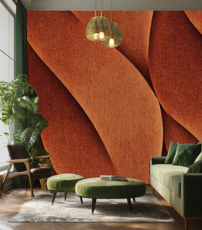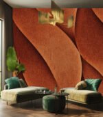Abstract design with overlapping, textured, rust-colored shapes creating a dynamic, flowing pattern. The composition evokes a sense of movement and depth.
