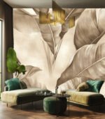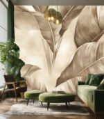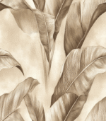 Intricate sepia-toned illustration of large tropical leaves, showcasing detailed textures and shading, creating a serene and elegant botanical pattern.