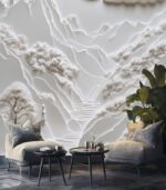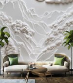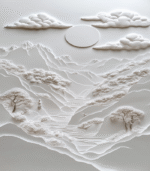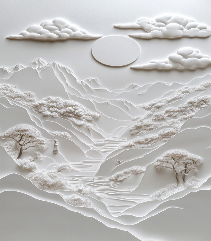 Intricate paper art depicting a serene landscape with mountains, trees, and clouds under a sun, showcasing delicate textures and harmonious design.