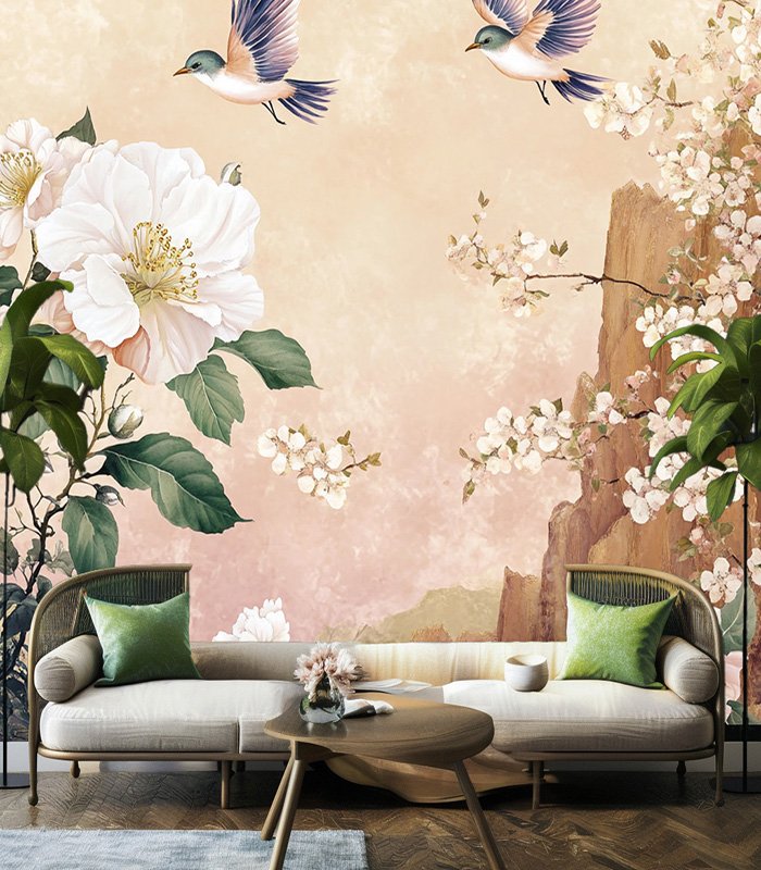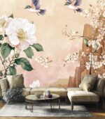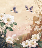 Two birds gracefully soar above blooming flowers and rocky cliffs, set against a serene pastel sky, creating a tranquil and harmonious scene.