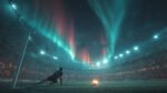 A goalkeeper prepares to save a soccer ball under vibrant auroras in a stadium filled with spectators.
