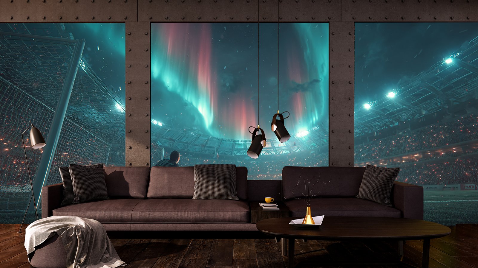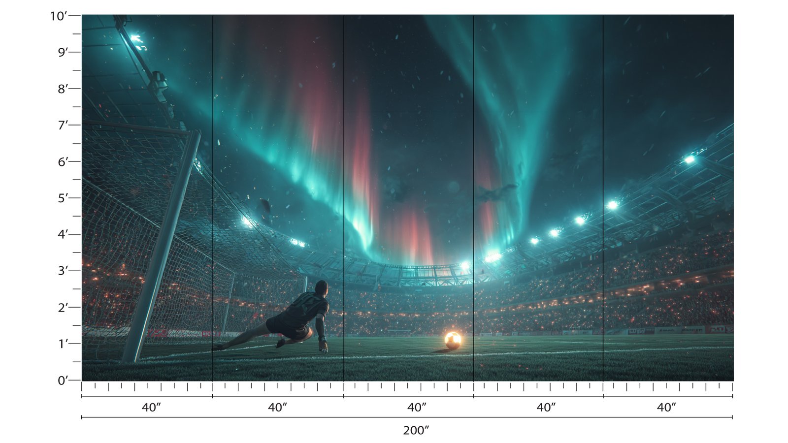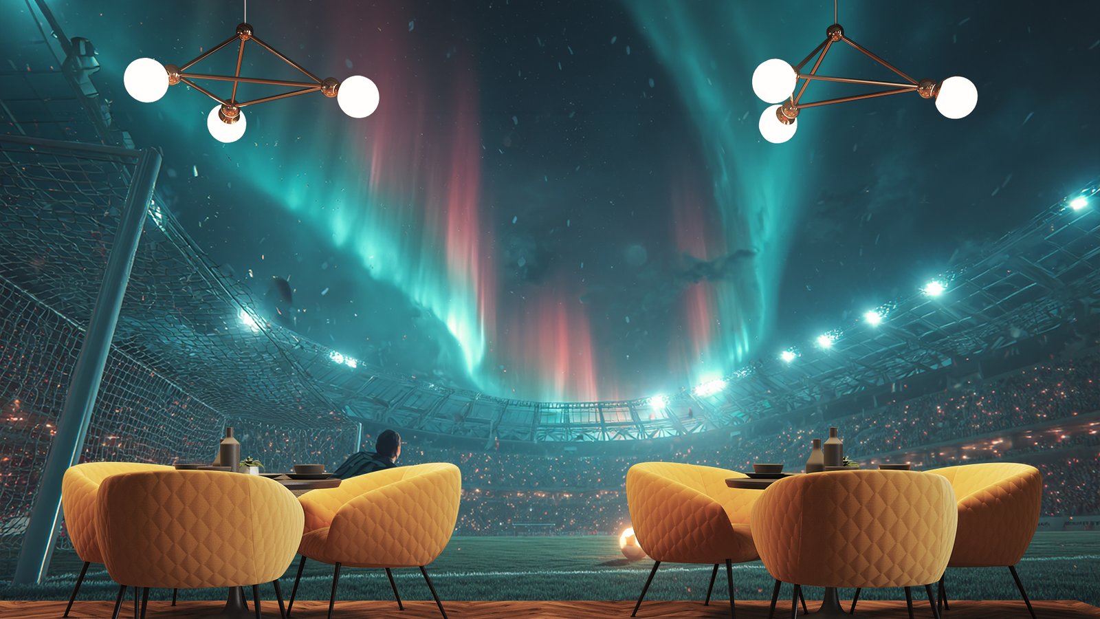 A goalkeeper prepares to save a soccer ball under vibrant auroras in a stadium filled with spectators.
