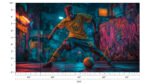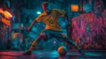 dynamic soccer player in yellow jersey performing a skill move with a ball in a vibrant urban setting