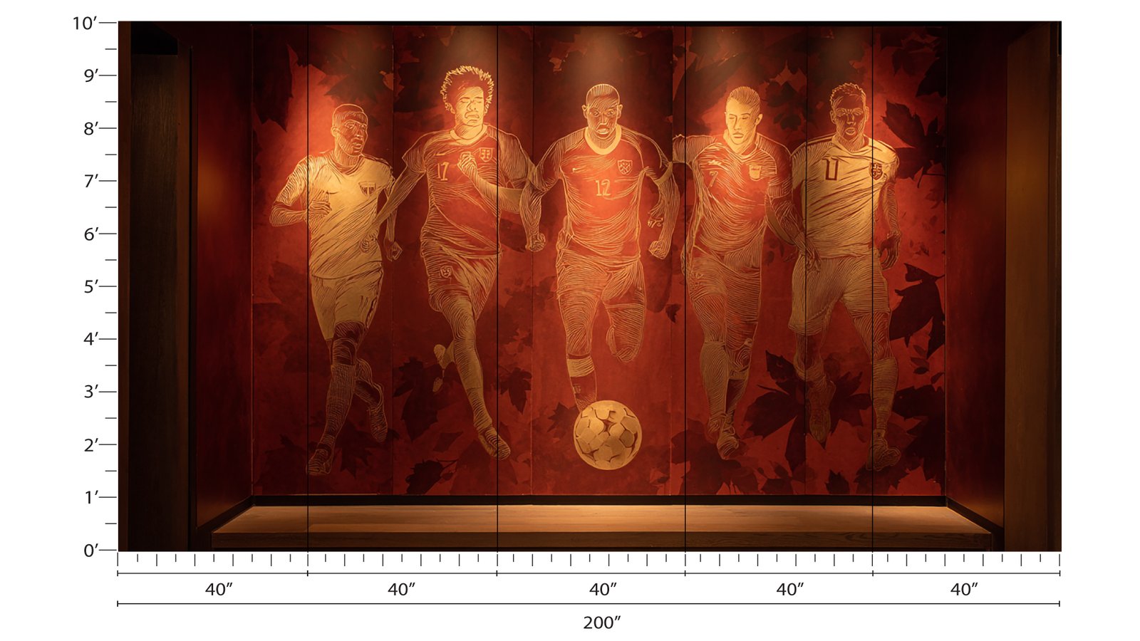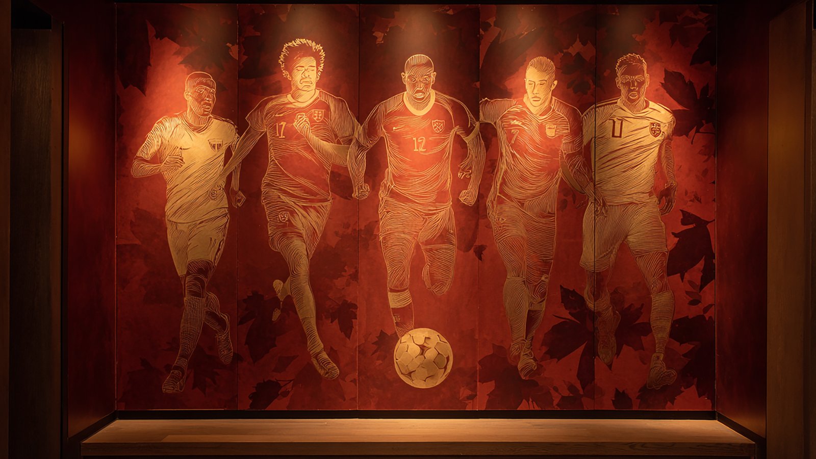 Artistic depiction of five soccer players in action with a soccer ball on a red background