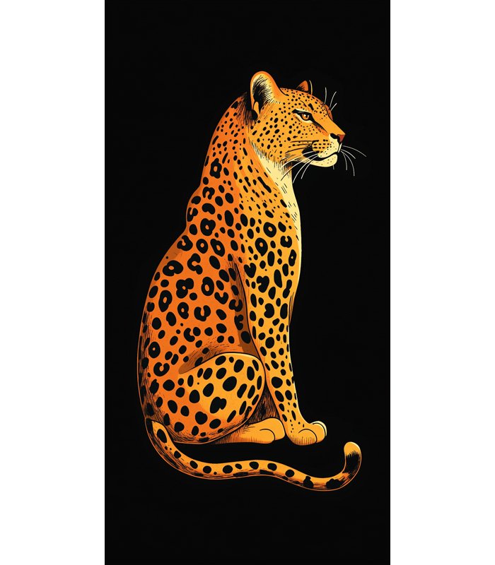 A vibrant illustration of a leopard sitting gracefully against a black background, showcasing its striking orange and black spotted coat in detail.