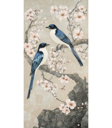 Two magpies perched on blossoming branches, surrounded by delicate pink flowers against a vibrant blue sky, creating a serene and picturesque scene.