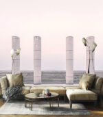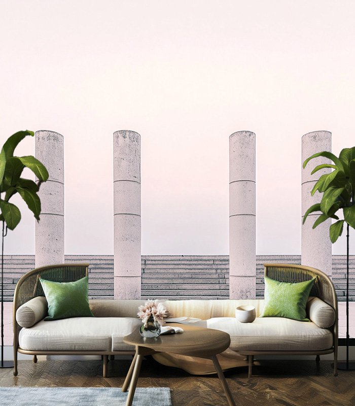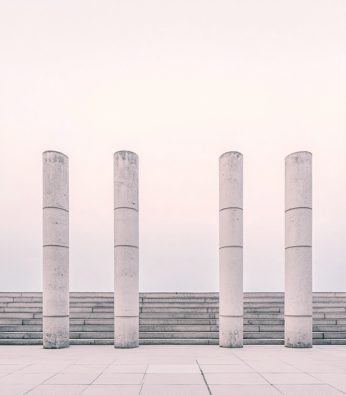 Four minimalist stone columns stand symmetrically against a soft, pastel sky, creating a serene and balanced architectural scene.