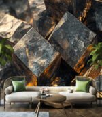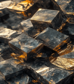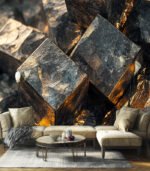 Golden sunlight illuminates the rugged surfaces of metallic cubes, casting intricate shadows and highlights, creating a visually striking geometric landscape.