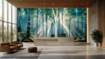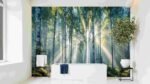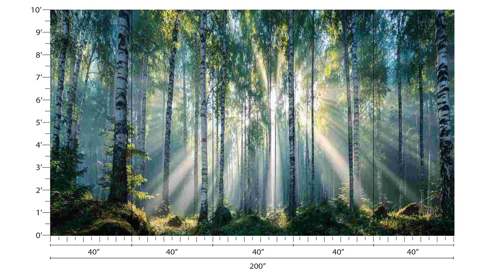| Sunlight streams through tall birch trees in a lush, green forest. |