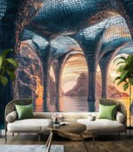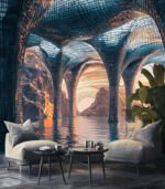 Futuristic mesh arches rise from tranquil waters, reflecting a vibrant sunset. The scene blends nature and architecture in a surreal, dreamlike landscape.