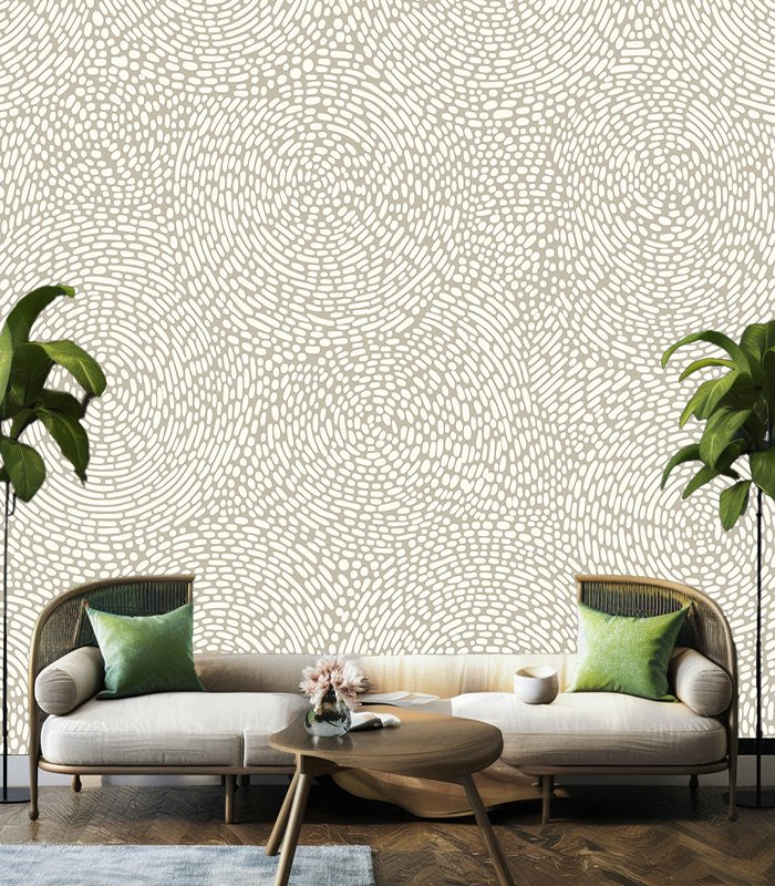 Abstract pattern with swirling, concentric lines and dots, creating a textured, organic design in neutral tones. Ideal for backgrounds or modern decor.