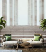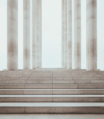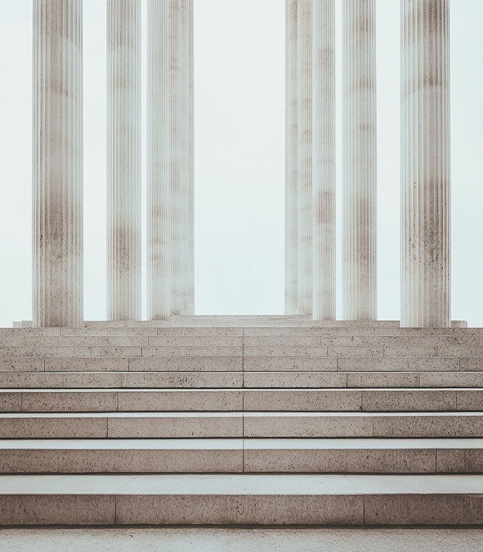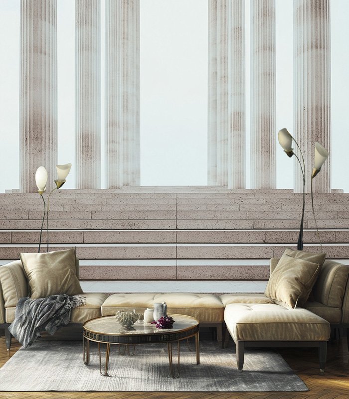 Majestic stone columns rise above wide steps, creating a grand architectural scene reminiscent of ancient temples, evoking a sense of history and timeless elegance.