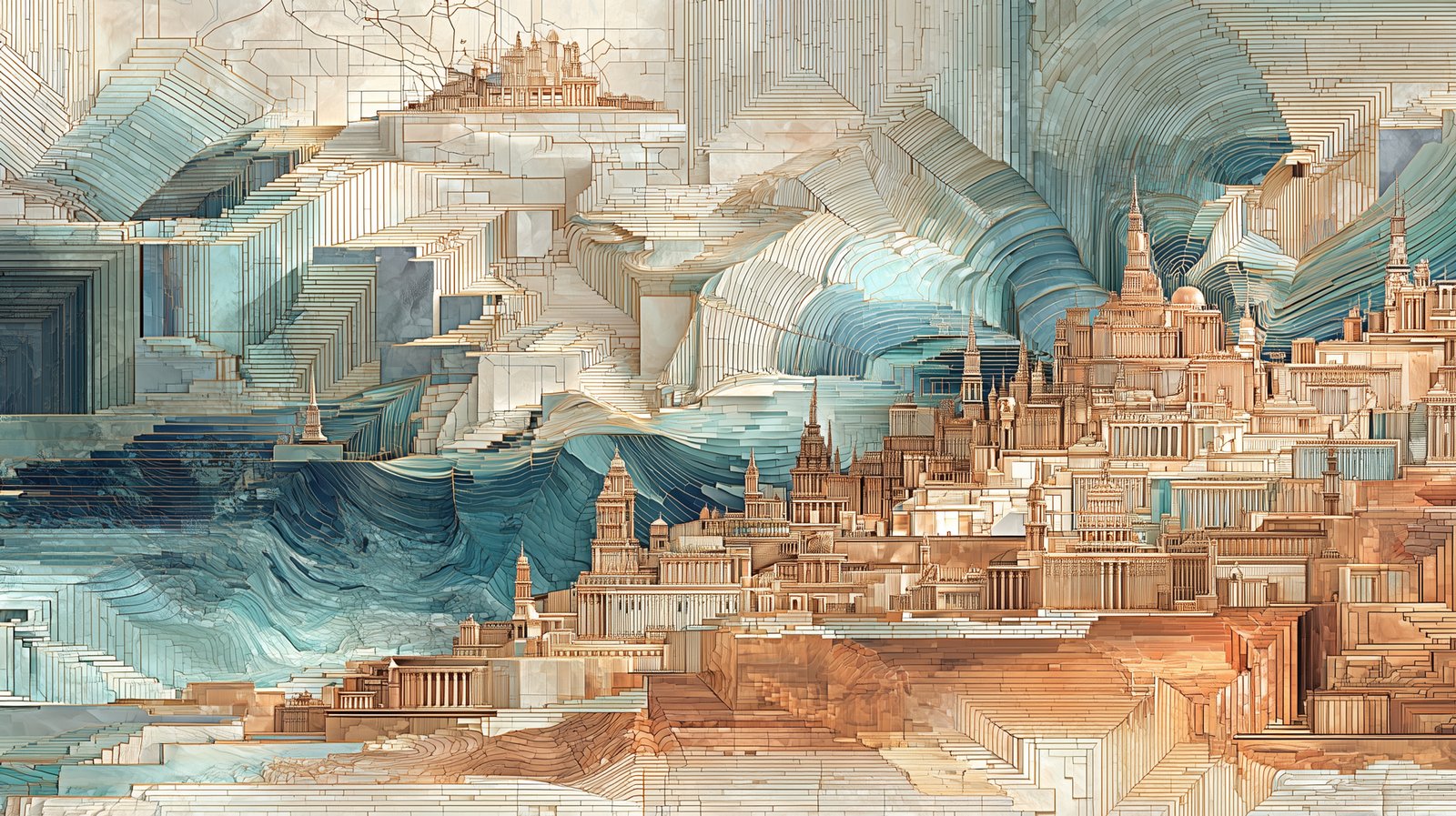 A surreal architectural cityscape where layered, geometric structures flow like carved stone and waves, blending warm sandstone tones with cool teal hues to create a futuristic yet timeless urban vision.