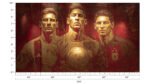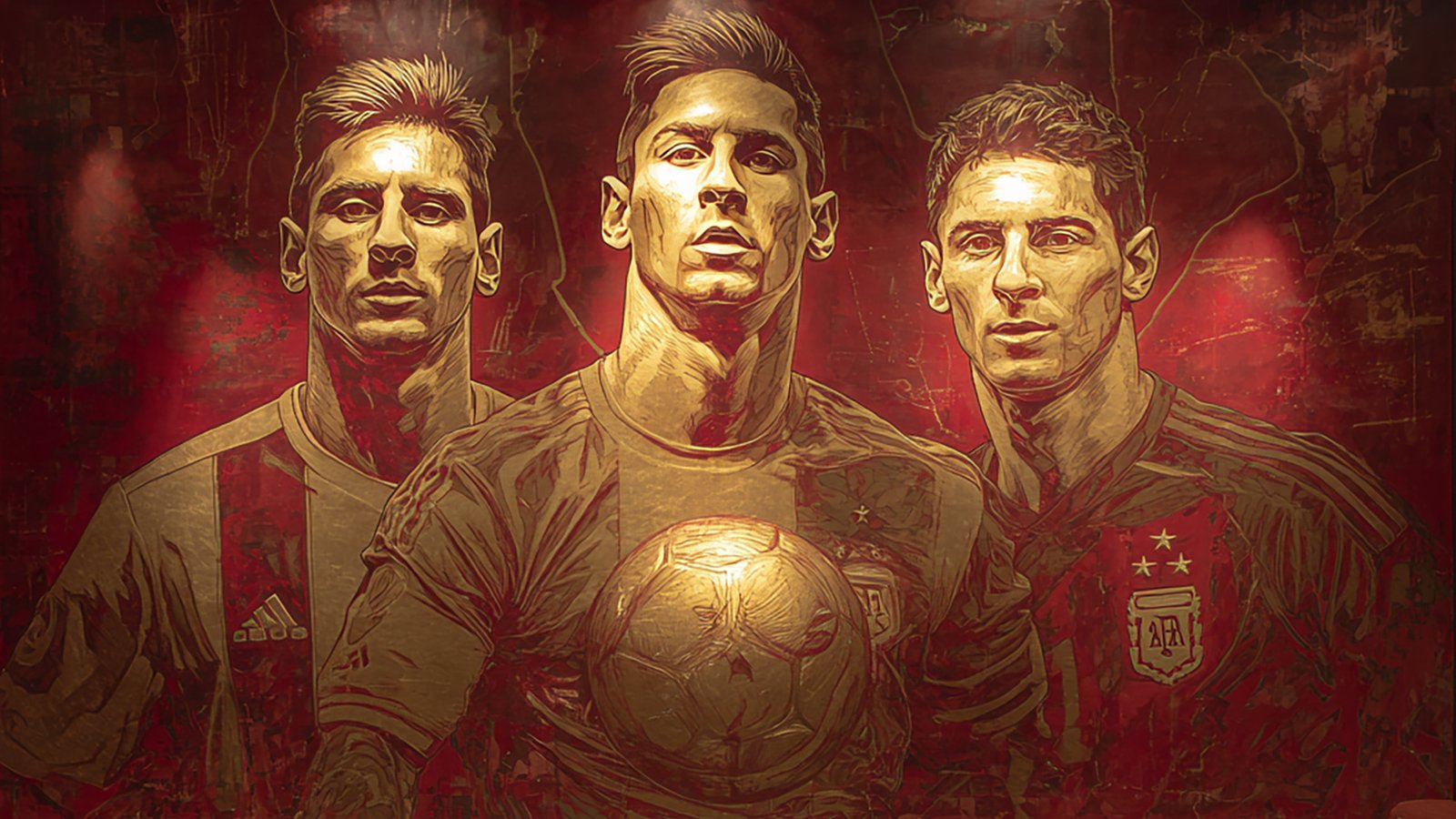 A dramatic, stylized portrait of Lionel Messi shown in three phases, highlighting his iconic football legacy.