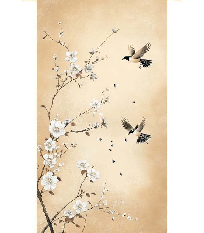Delicate blossoms and graceful birds in flight create a serene, nature-inspired artwork on a soft beige background, evoking tranquility and elegance.