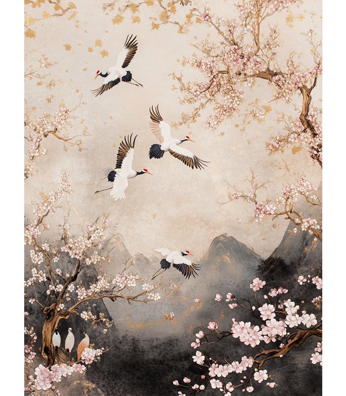 Cranes gracefully soar among cherry blossoms and golden leaves, set against a serene mountainous backdrop, capturing the essence of tranquility and natural beauty.