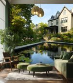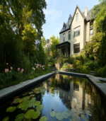 A serene garden scene with a tranquil pond, blooming pink flowers, and a charming house surrounded by lush greenery under a clear blue sky.