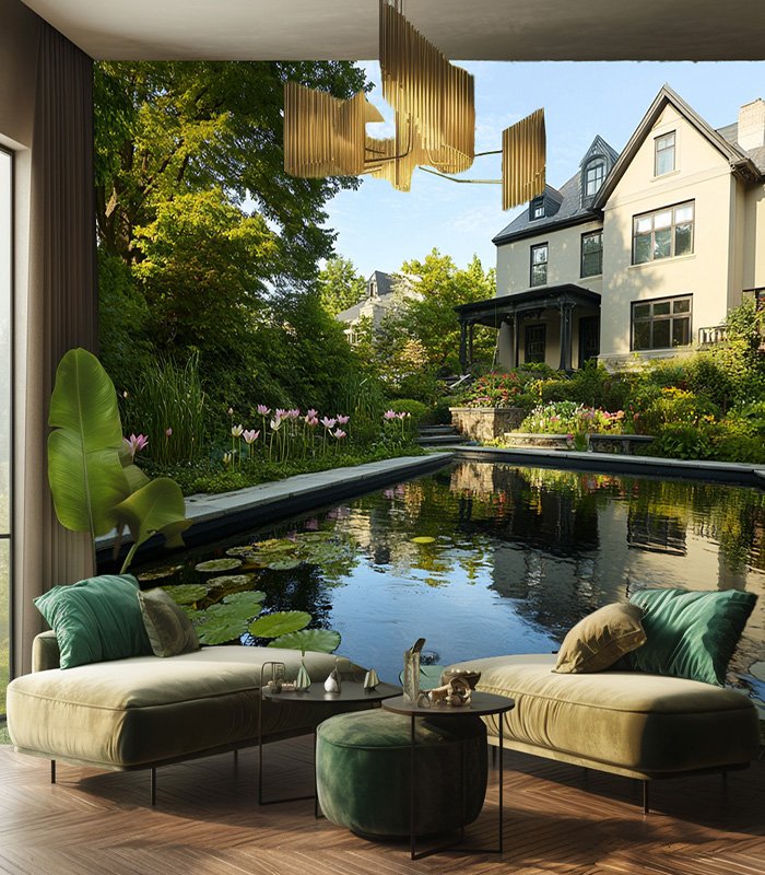 A serene garden scene with a tranquil pond, blooming pink flowers, and a charming house surrounded by lush greenery under a clear blue sky.
