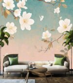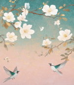 Delicate white flowers and two birds gracefully adorn a pastel sky, creating a serene and enchanting nature-inspired scene.