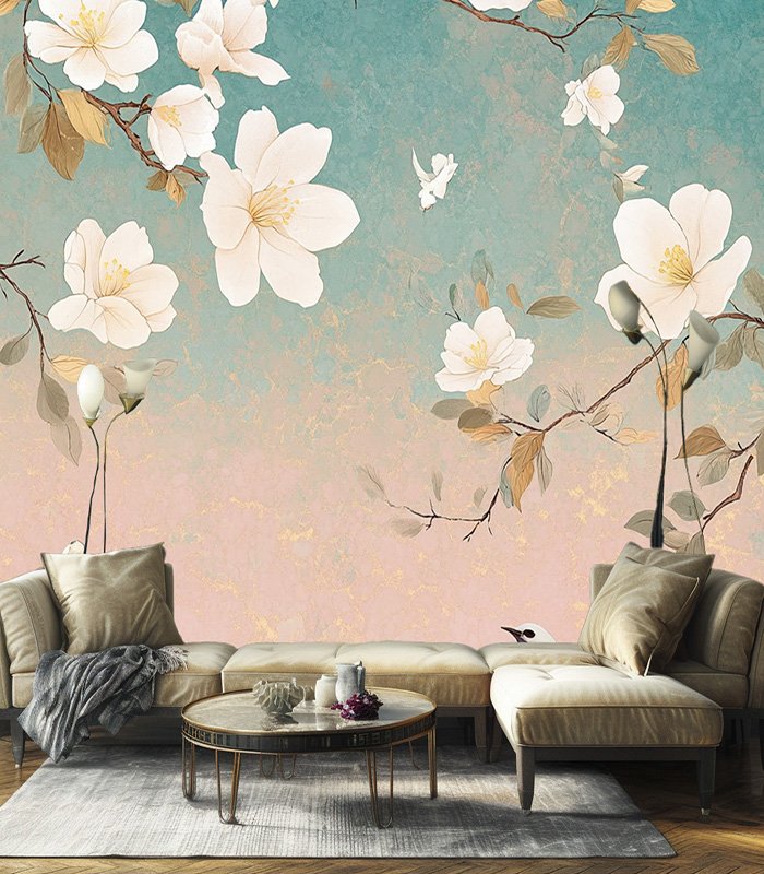 Delicate white flowers and two birds gracefully adorn a pastel sky, creating a serene and enchanting nature-inspired scene.