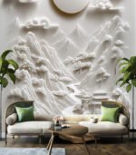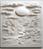 Intricate 3D relief art depicting serene mountains, flowing river, and traditional architecture under a luminous sun and fluffy clouds, all in monochromatic white.