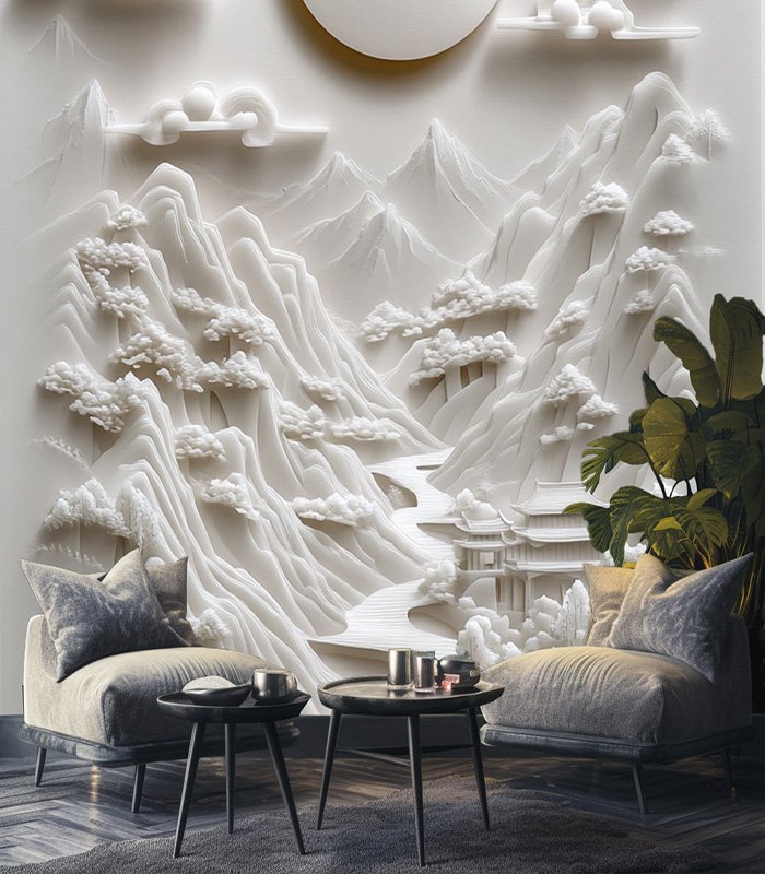 Intricate 3D relief art depicting serene mountains, flowing river, and traditional architecture under a luminous sun and fluffy clouds, all in monochromatic white.