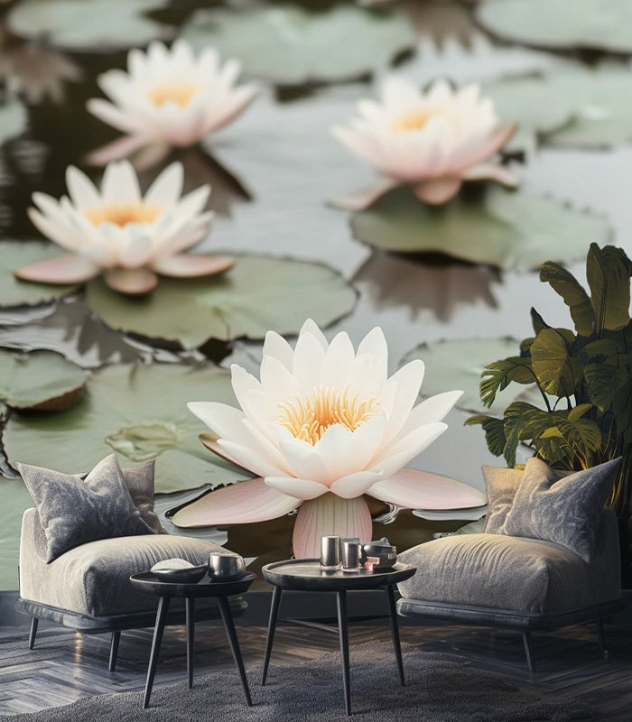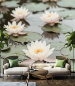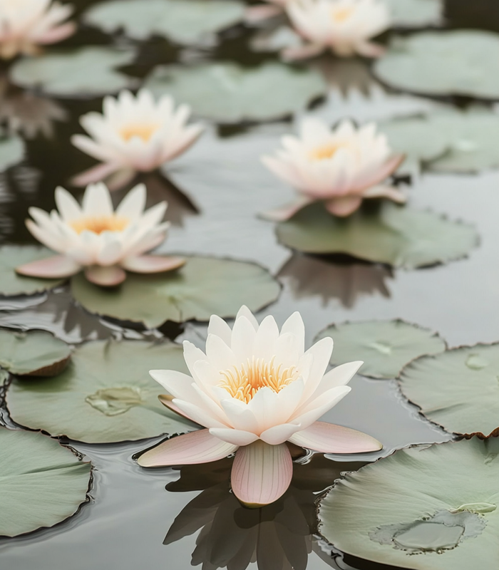 Serene water lilies float gracefully on a tranquil pond, their delicate white petals contrasting beautifully with the lush green lily pads beneath.
