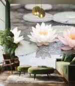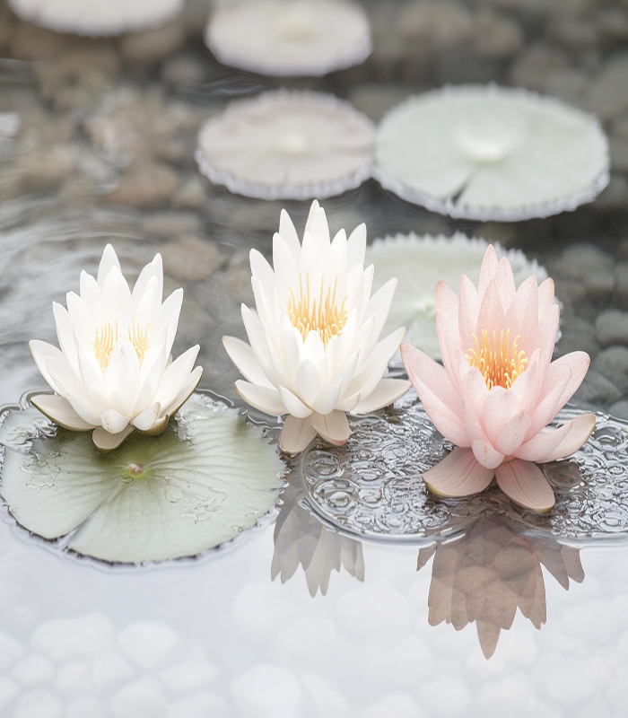 Three delicate water lilies, two white and one pink, float serenely on a tranquil pond, surrounded by soft ripples and lily pads.