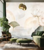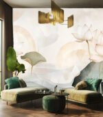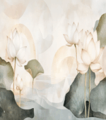 Delicate watercolor illustration of blooming lotus flowers and leaves, set against a soft, abstract background, evoking tranquility and natural beauty.