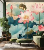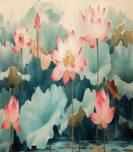 Delicate pink lotus flowers bloom gracefully amidst lush green leaves, creating a serene and tranquil aquatic scene in this beautiful artwork.