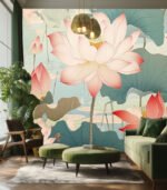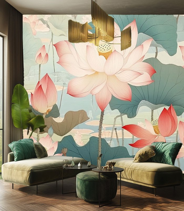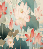 Delicate pink lotus flowers bloom gracefully amidst lush green leaves, creating a serene and tranquil aquatic scene in this beautiful artwork.
