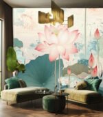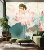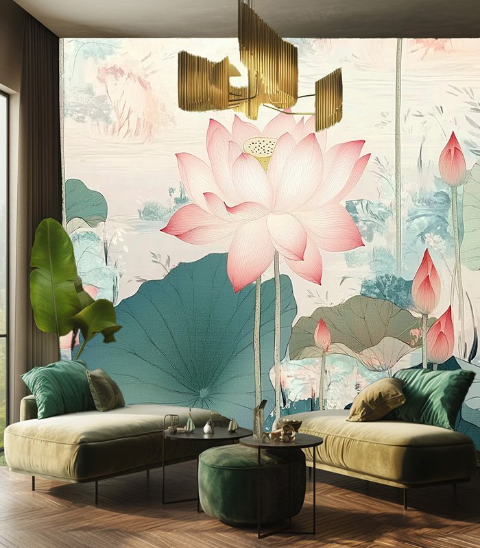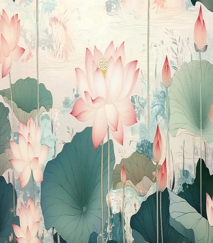 Delicate pink lotus flowers bloom gracefully amidst lush green leaves, set against a serene, watercolor-inspired background, evoking tranquility and natural beauty.