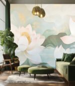 Delicate lotus flowers bloom gracefully amidst serene waters, surrounded by soft pastel hues and gentle brushstrokes, evoking tranquility and natural beauty.