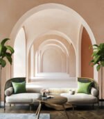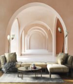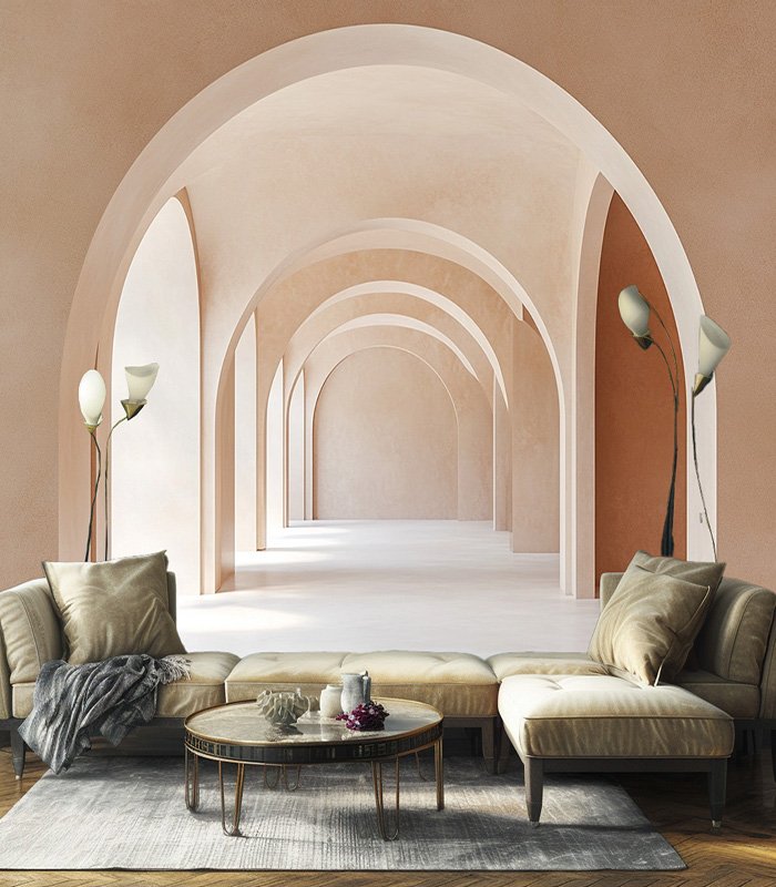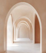 A serene corridor of soft, neutral-toned arches creates a calming, minimalist atmosphere, inviting exploration and contemplation in its gentle, flowing design.