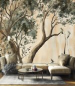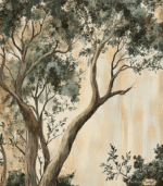 Artistic depiction of a tree with lush foliage against a textured, earthy background, capturing nature’s elegance and tranquility in a serene composition.