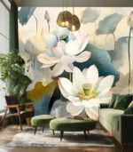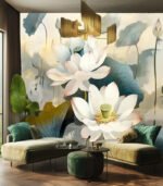 Three delicate white water lilies float serenely on a calm pond, reflecting soft light and creating a tranquil, peaceful atmosphere.