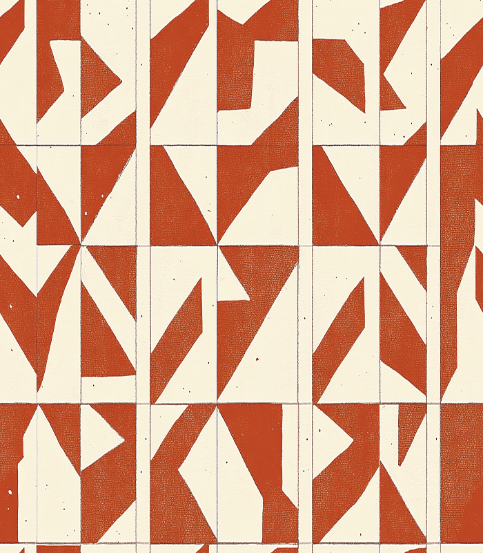 Geometric pattern with red and white triangles and rectangles, creating an abstract, repetitive design. The grid layout adds a structured, modern aesthetic.