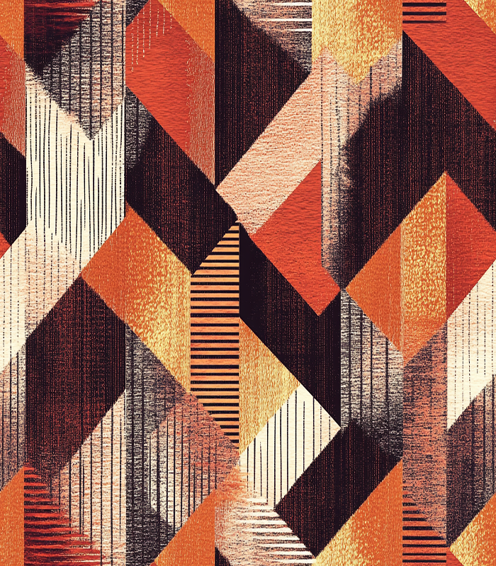 Abstract geometric pattern with overlapping triangles and lines in warm tones of orange, red, and beige, creating a textured, dynamic visual effect.