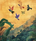 - Two vibrant birds in flight among lush tropical foliage, set against a backdrop of misty mountains, creating a serene and exotic natural scene.