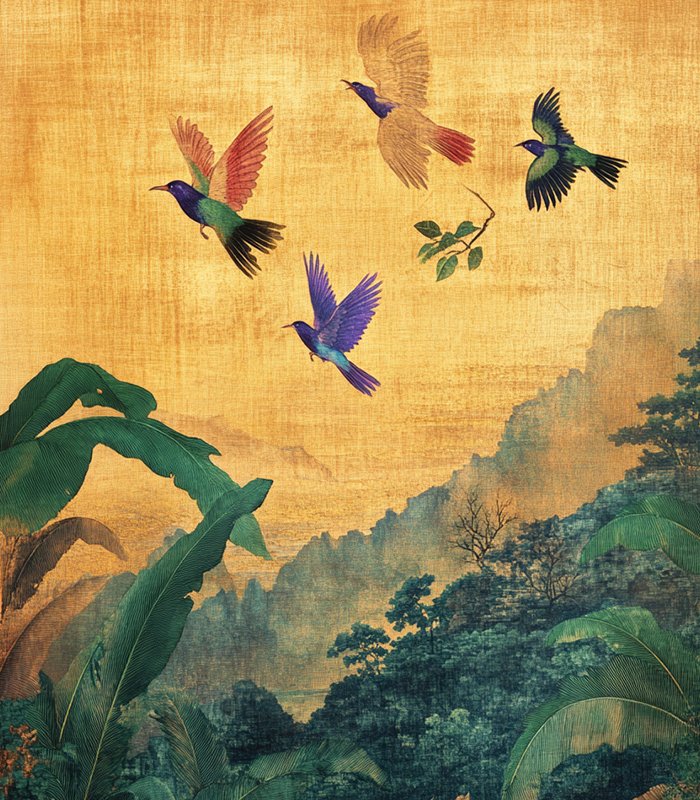 - A vibrant bird in flight over a lush, tropical landscape, depicted in a vintage, textured style that evokes a sense of timeless natural beauty.