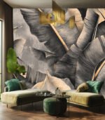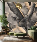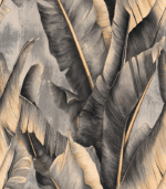 Abstract illustration of overlapping banana leaves in muted tones, creating a textured, tropical pattern with intricate line details and a vintage aesthetic.