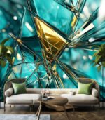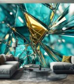 Abstract geometric shapes in a vibrant turquoise and gold color palette, creating a dynamic and visually captivating 3D digital art composition.