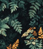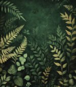 - A serene botanical painting depicting various types of foliage in shades of green, creating a lush and textured tapestry of leaves against a dark background.