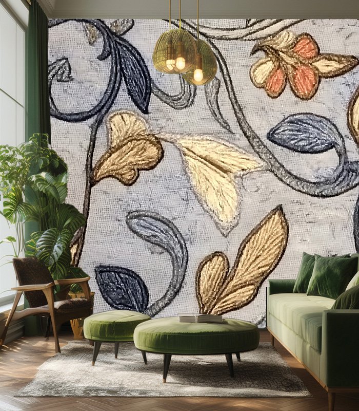 Vintage floral wallpaper with vertical stripes in soft pink, beige, and green hues, featuring delicate flower motifs and intricate border patterns.