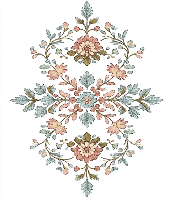Intricate floral pattern with pastel pink, green, and blue hues, showcasing symmetrical design and delicate leaves, creating an elegant and vintage aesthetic.