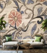 Vintage floral wallpaper with vertical stripes in soft pink, beige, and green hues, featuring delicate flower motifs and intricate border patterns.