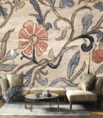 Vintage floral wallpaper with vertical stripes in soft pink, beige, and green hues, featuring delicate flower motifs and intricate border patterns.