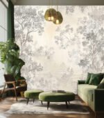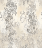 Vintage floral wallpaper with vertical stripes in soft pink, beige, and green hues, featuring delicate flower motifs and intricate border patterns.