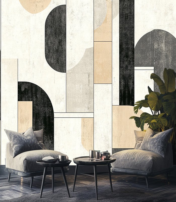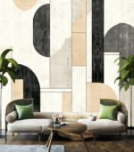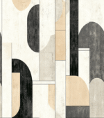 Abstract geometric design with overlapping shapes in neutral tones of black, beige, and gray, creating a modern, textured pattern with a vintage feel.