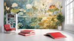 A serene underwater view featuring various water lilies and aquatic plants in soft pastel colors.